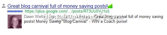 This is a search that I did. I just typed in Dawn Wells. Granted it’s not a great example seeing that I share the name with the Giligan’s Island Star. π Anyway, see how my picture appears next to the post. Among other great benefits, this makes my post stand out from others that I may be competing with. See the other thing that is interesting about this example? It’s actually a link to my google plus post. It does work! π
