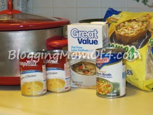 Add frozen chicken breasts to crock pot with cream of chicken soup, and chicken broth.