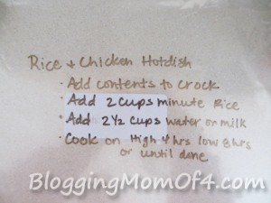 You may have to adjust cooking times. I cooked all of the chicken ahead of time so all that is needed is for the meals to thaw out and for the other ingredients to cook. That may not take the time stated. All slow cookers/crockpots are also different so just watch your meals and adjust accordingly. Make sure to also check out my Bulk Cooking Tips.