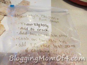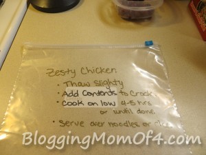 When prepping your Crockpot Freezer Meals, get your freezer bags out ahead of time. Write the Meal on the bag and instructions. After adding all ingredients, squeeze out as much air as you can, lay flat to freeze.