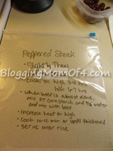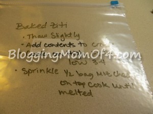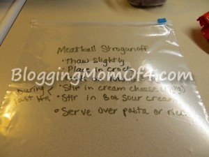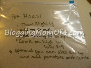 When prepping your Crockpot Freezer Meals, get your freezer bags out ahead of time. Write the Meal on the bag and instructions. After adding all ingredients, squeeze out as much air as you can, lay flat to freeze.