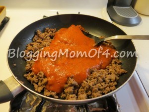 Prepare dinner following basic directions. Meanwhile, brown meat in large skillet; drain. Stir in sauce.