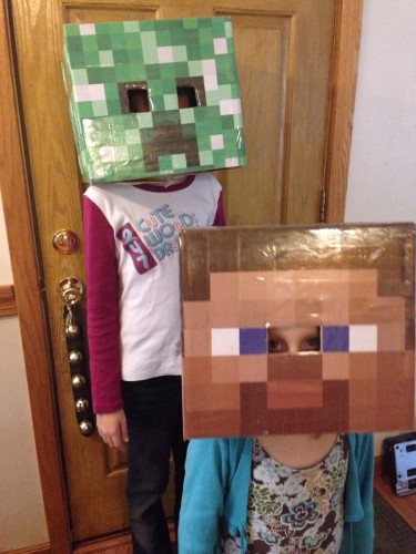 My girls LOVE their Minecraft Costumes! And I love that they can wear normal clothes because their heads are costumes enough. 🙂 When you live in a cold weather state, you never know what the weather will be like…whether you’ll need to a winter jacket or a short sleeve shirt. Most of the time, we end up having to cover up most of their costume with winter outerwear.