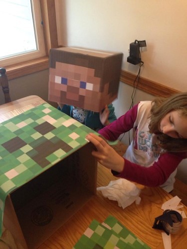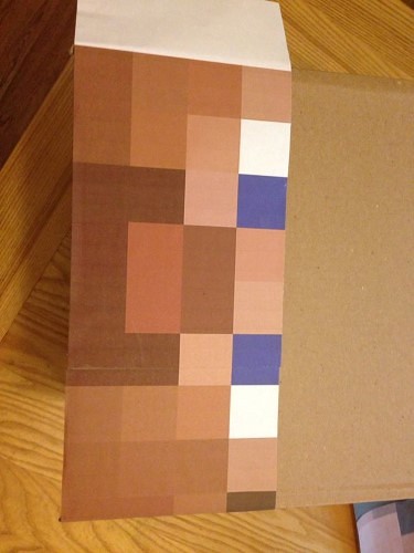I picked up 2 boxes 12x12x12 at Walmart under $1 a piece. Then I found printable patterns for the Steve character and for a Creeper.