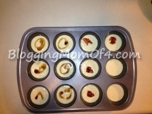 For fun I used food coloring, mini m&ms, chocolate chips, sprinkles. The kids thought they were fun, but the ones that really were my and my husband’s favorites were the pizza ones. I didn’t have any bacon or sausage, but I had pepperonis. I cut them up tiny, put some Italian seasoning, garlic salt (may make it too salty for some) and right at the end I left only the pizza ones in the pan, added mozzarella and turned the oven off so they could finish melting. Added some siracha on the top and they were amazing.