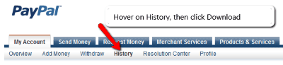 Open up your PayPal account. Hover over history, then click on Download History.