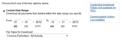 Add in the custom date range of when you’re wanting to pull. Monthly, yearly, etc. and also the file type for download. I chose the Comma Delimited – all activity.